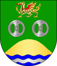 Shield Vert two wheels Argent arrayed in fess with their spokes in pale, in chief a wyvern passant Or garnished Gules, issuant from base wavy Azure, charged with a bar Argent, a mound Or (see left image above).