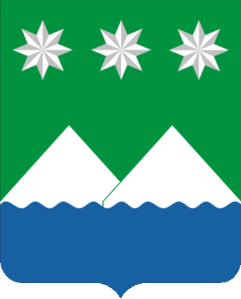 In a green field with an azure wavy base, a silver double mountain with peaks like points, accompanied at the top by three eight-pointed stars of the same metal.