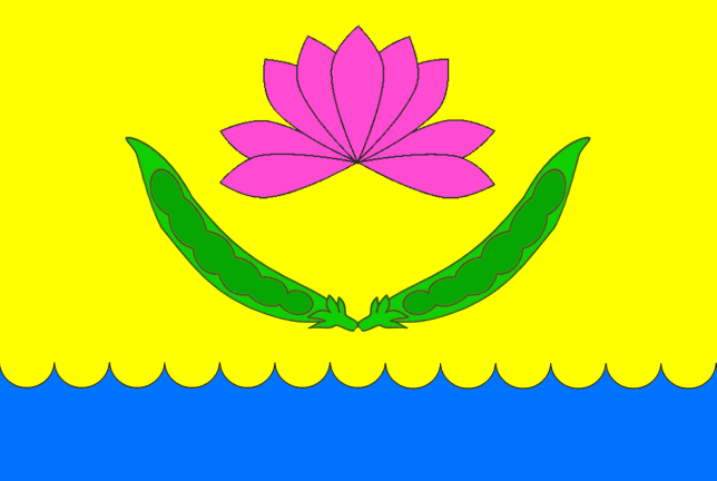 A yellow rectangular cloth with a width to length ratio of 2:3, with a blue jagged stripe along the bottom edge of the cloth at 1/4 of the cloth's width, reproducing in the middle of the yellow part of the cloth a crimson (pink) lotus flower above two green soybean pods placed below, joined at the base and diverging upward and to the sides.