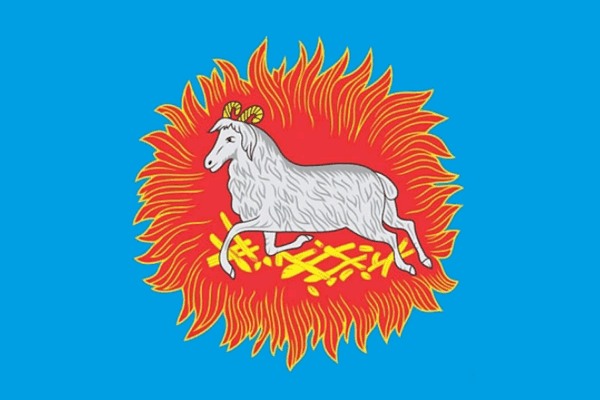 In an azure (light blue) field, a silver ram with golden horns, lying on golden brands; everything is engulfed in gules (red) with a thin golden border of flame.