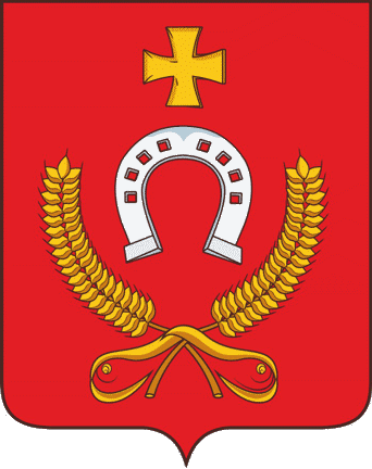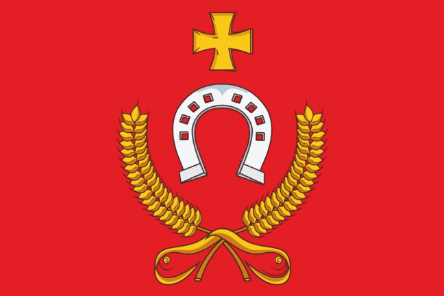 In a red field – a silver horseshoe, horns down, between two golden ears of