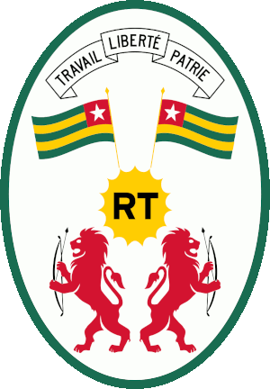 centre is a golden sun-like shield bearing the letter RT (Republique Togolaise), whilst rising from this