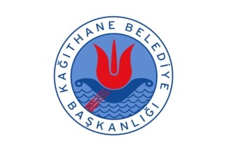 The former flag of Kağıthane was white with the same emblem, differing by thicker letters. "Belediyese Başkanlığı" means "Municipality Presidency".