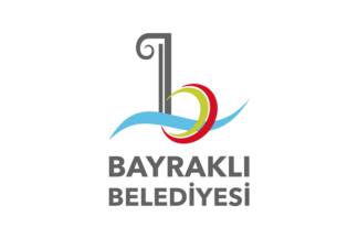 The flag of Bayraklı (photo, photo), also used vertically (photo), is white with the municipality's emblem. "Belediyesi" means "Municipality".