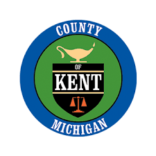 County of Kent, Michigan: a deep yellow 3:5 flag with a colored seal centered on it. This is green, with a shield on it: sable between two fesslets or the word "KENT" in capitals argent all above a scales gules, in chief the word "OF" in capitals argent, an oil lamp for crest. Separated from the rest by a black rim, a dark blue ring reads "COUNTY" above and "MICHIGAN" below.