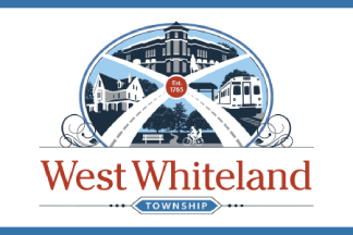 The flag is a white field with two thin light blue bars on the top and bottom of the flag, and centered with the township logo.