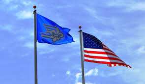 A blue flag with a golden fleur de lys is seen flying on campus.