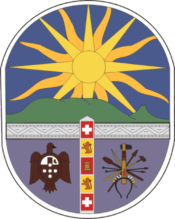 The horizontal dividing line is charged with a native decoration; the vertical dividing line represents a border post, divided in five quarters charged by a cross, a lion, a castle, a lion and a cross, respectively.