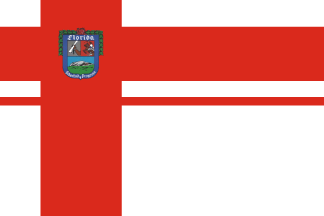 seen. A vertical red stripe is offset to the right by 1/8 of the flag's height;
