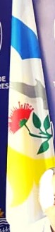 The coat of arms of Treinta y Tres was created by José Gorosito Tanco, being designed for the 75th anniversary of his former school Santa Catalina de Sena in 1955. Underneath the shield, a ribbon reads TREINTA Y TRES EL PAGO MAS ORIENTAL [Treinta y Tres, the Easternmost Countryland]. The shield is diagonally divided into three sections. The uppermost section depicts a background of 9 alternating stripes of white and blue, reminiscent of the national flag. The four stripes are for the Cebollati, Olimar, Yerbal, and Laguna Merín streams. A coast by the Olimar River is seen, as well as a white circle which depicts over it a sword with two spears crossed together behind it, serving as a reminder of the Spanish and Indian origins of the people. The central section depicts the points of the spears of the Thirty-Three Orientals in blue, from whom the name is derived. The lower section depicts a branch from which three ceiba flowers emerge as a national flower. Serving as a crest to the shield is a sun, also reminiscent of the national flag.