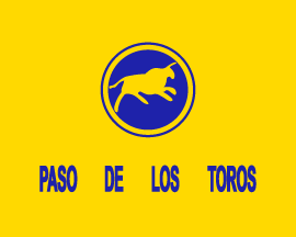 The Isabelina League of Football flag is yellow with, in this case, a yellow bull in a blue circle outlined in yellow then blue. Underneath, PASO DE LOS TOROS is written. Other versions, often handmade, simply have the bull in blue and the LIGA ISABELINA DE FUTBOL name above with PASO DE LOS TOROS underneath. Indeed, the logo references its name meaning Pass of the Bulls.